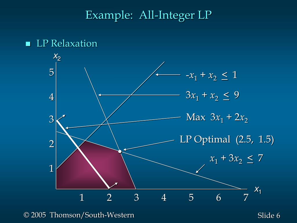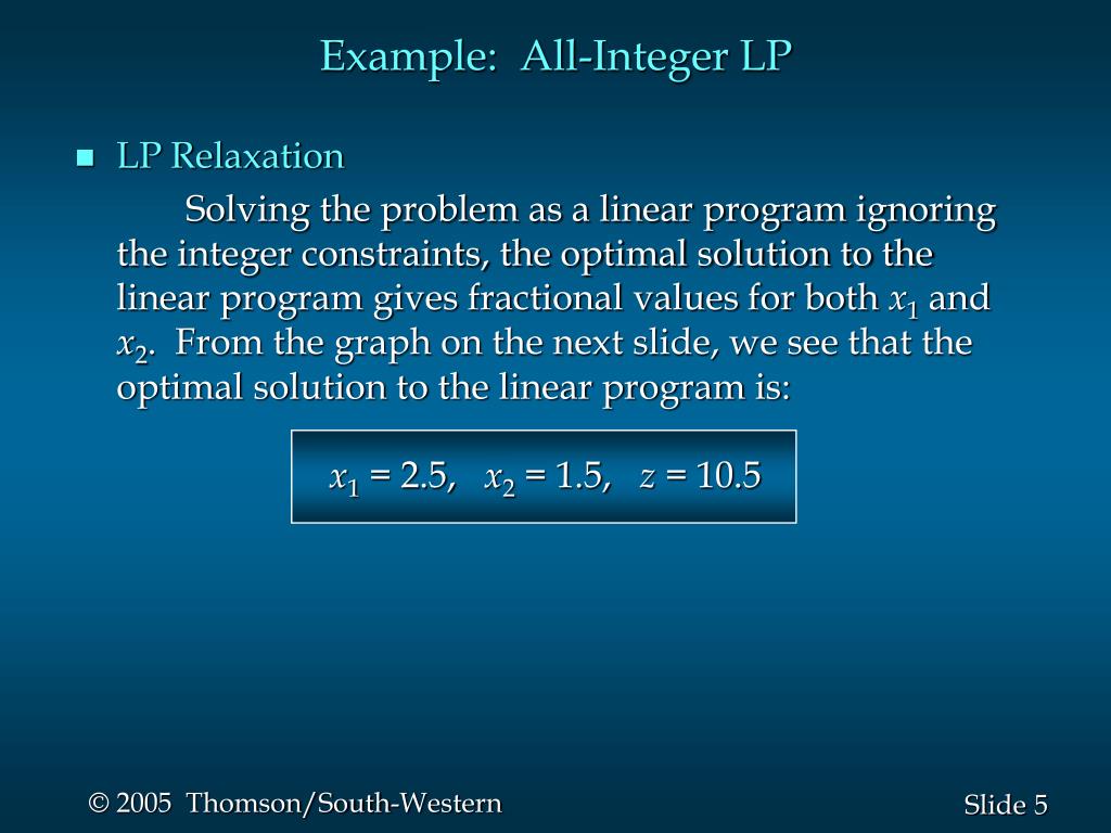 Example: All-Integer LP • LP Relaxation Solving the problem as a linear program ignoring the integer constraints, the optimal solution to the linear program gives fractional values for both x1 and x2. From the graph on the next slide, we see that the optimal solution to the linear program is: x1 = 2.5, x2 = 1.5, z = 10.5