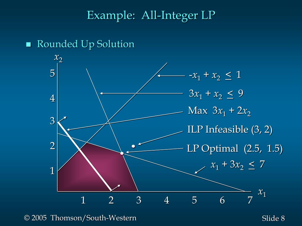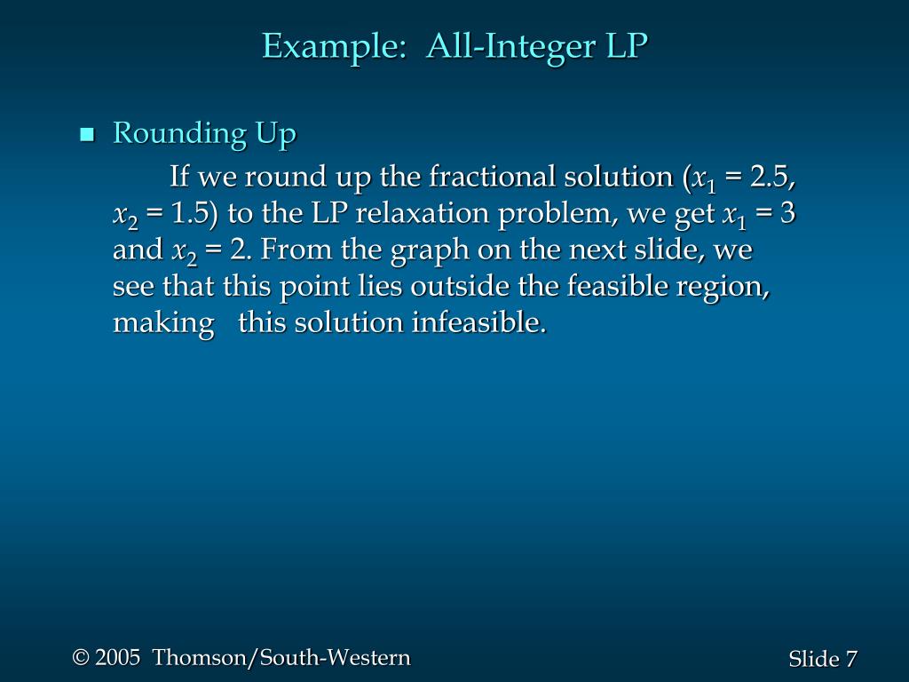 Example: All-Integer LP • Rounding Up If we round up the fractional solution (x1 = 2.5, x2 = 1.5) to the LP relaxation problem, we get x1 = 3 and x2 = 2. From the graph on the next slide, we see that this point lies outside the feasible region, making this solution infeasible.