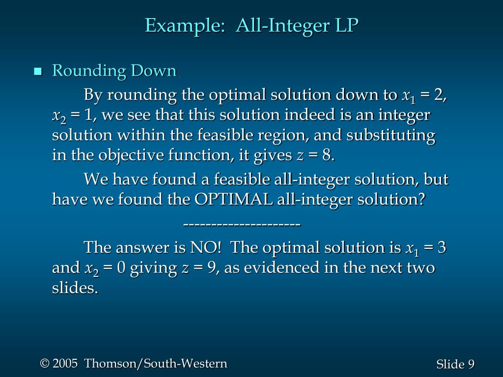 Example: All-Integer LP • Rounding Down By rounding the optimal solution down to x1 = 2, x2 = 1, we see that this solution indeed is an integer solution within the feasible region, and substituting in the objective function, it gives z = 8. We have found a feasible all-integer solution, but have we found the OPTIMAL all-integer solution? --------------------- The answer is NO! The optimal solution is x1 = 3 and x2 = 0 giving z = 9, as evidenced in the next two slides.