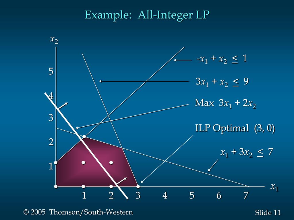 Example: All-Integer LP x2 -x1 + x2< 1 5 3x1 + x2< 9 4 Max 3x1 + 2x2 3 ILP Optimal (3, 0) 2 x1 + 3x2< 7 1 x1 1 2 3 4 5 6 7