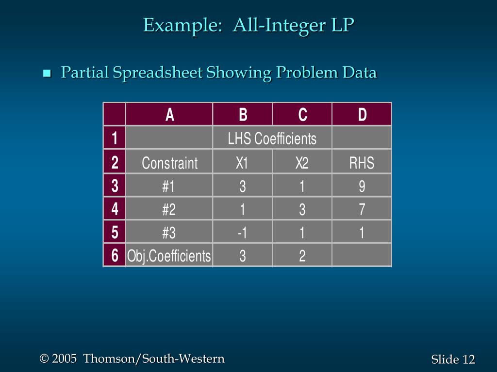 Example: All-Integer LP • Partial Spreadsheet Showing Problem Data