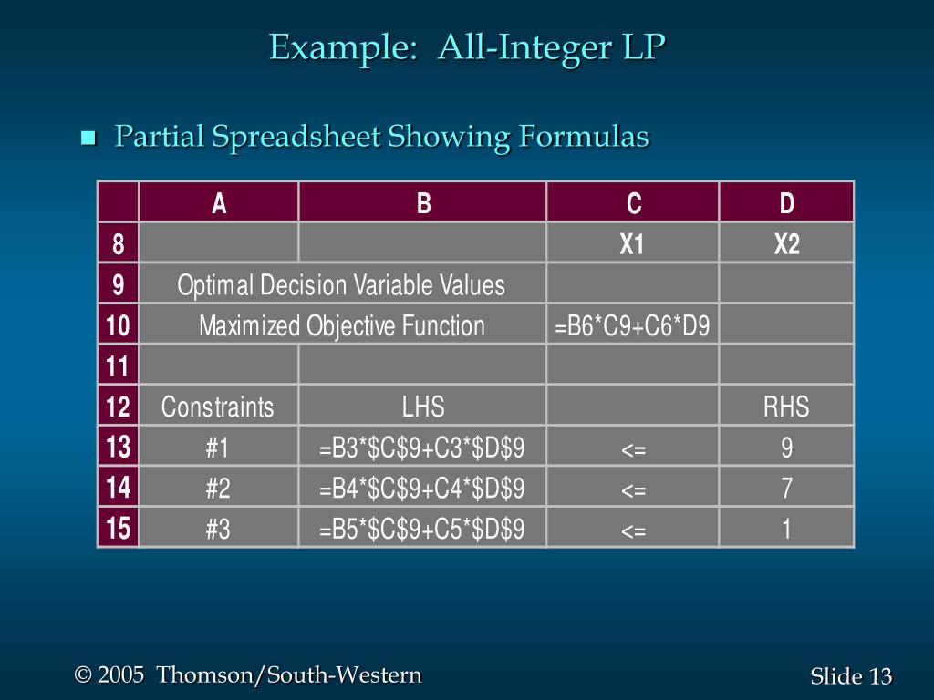 Example: All-Integer LP • Partial Spreadsheet Showing Formulas
