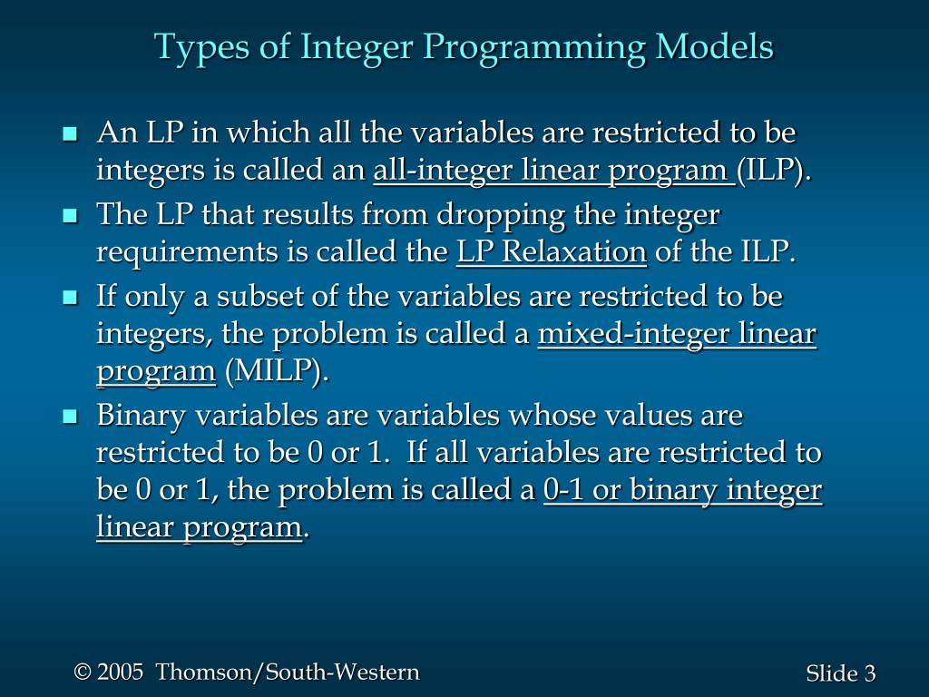 Types of Integer Programming Models • An LP in which all the variables are restricted to be integers is called an all-integer linear program (ILP). • The LP that results from dropping the integer requirements is called the LP Relaxation of the ILP. • If only a subset of the variables are restricted to be integers, the problem is called a mixed-integer linear program (MILP). • Binary variables are variables whose values are restricted to be 0 or 1. If all variables are restricted to be 0 or 1, the problem is called a 0-1 or binary integer linear program.