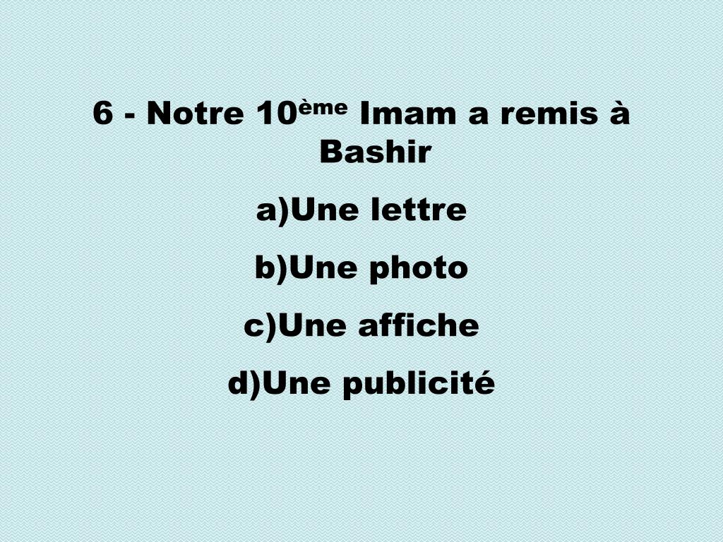 4 - Notre 10ème Imam a demandé à Bashir d’aller à • Baghdad • Samarra • Karbala • Najaf