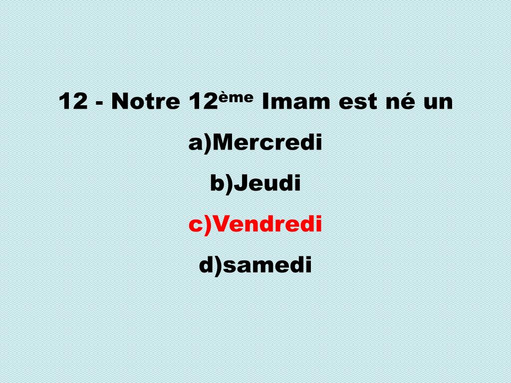 13 - La date de naissance de notre 12ème Imam est le • 15 Rajab 255 A.H. • 15 Shaban 255 A.H. • 5 Rajab 265 A.H. • 15 Shaban 255 A.H.