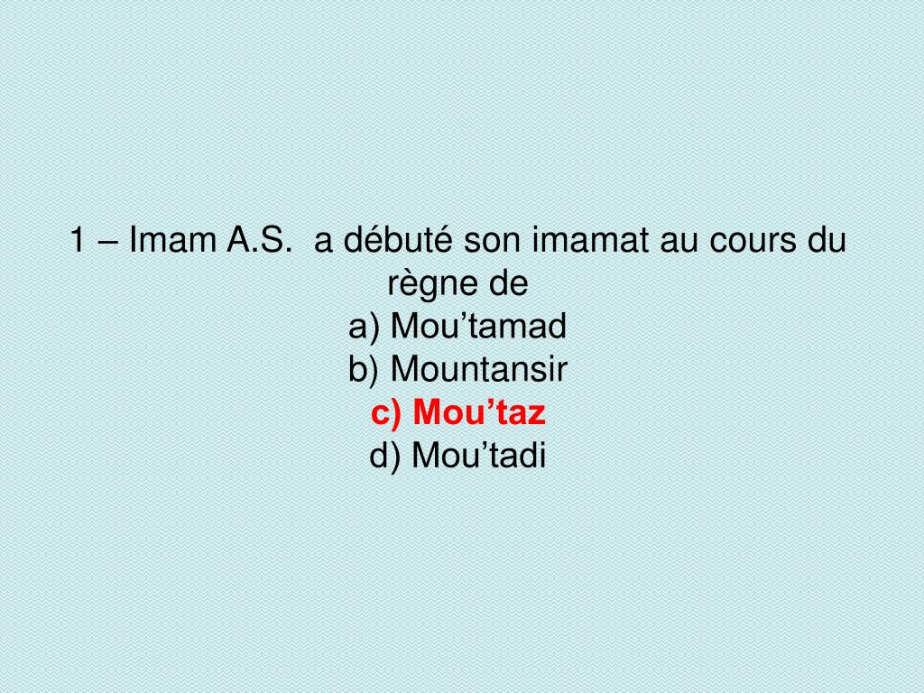 1 – Imam A.S. a débuté son imamat au cours du règne de a) Mou’tamad b) Mountansir c) Mou’taz d) Mou’tadi
