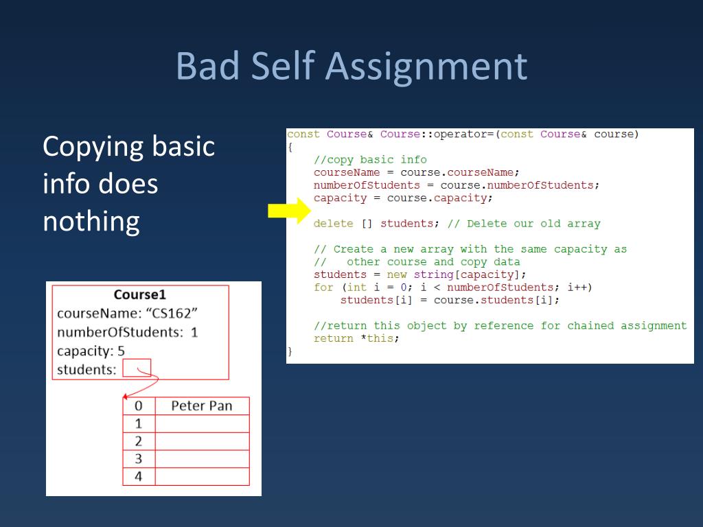 The Assignment Operator. Rule of Three. Any object which manages memory needs: Custom Destructor Custom Copy Constructor Custom Assignment Operator (now). Copy Constructor. Generally need a deep copy not a shallow one: YES NO. Copy Constructor Recipee. Basic copy constructor recipe:.