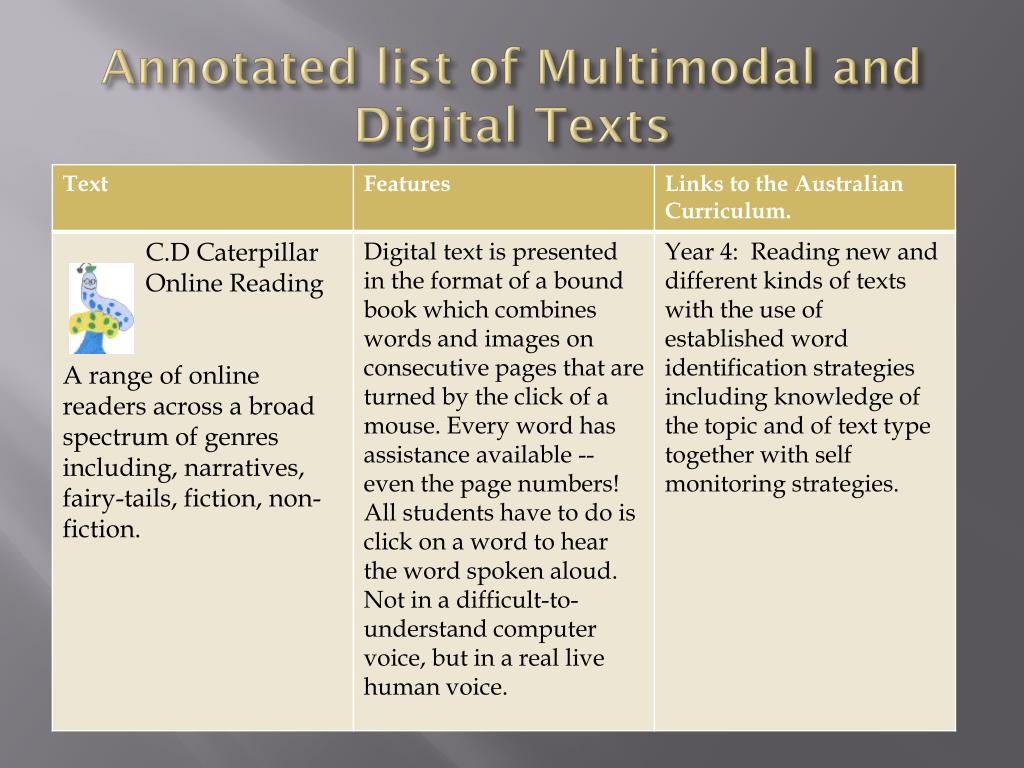 What are Multimodal Texts? • A text may be defined as multimodal when it combines two or more semiotic systems. There are five semiotic systems in total: • Linguistic: comprising aspects such as vocabulary, generic structure and the grammar of oral and written language • Visual: comprising aspects such as colour, vectors and viewpoint in still and moving images • Audio: comprising aspects such as volume, pitch and rhythm of music and sound effects • Gestural: comprising aspects such as movement, speed and stillness in facial expression and body language • Spatial: comprising aspects such as proximity, direction, position of layout and organisation of objects in space.