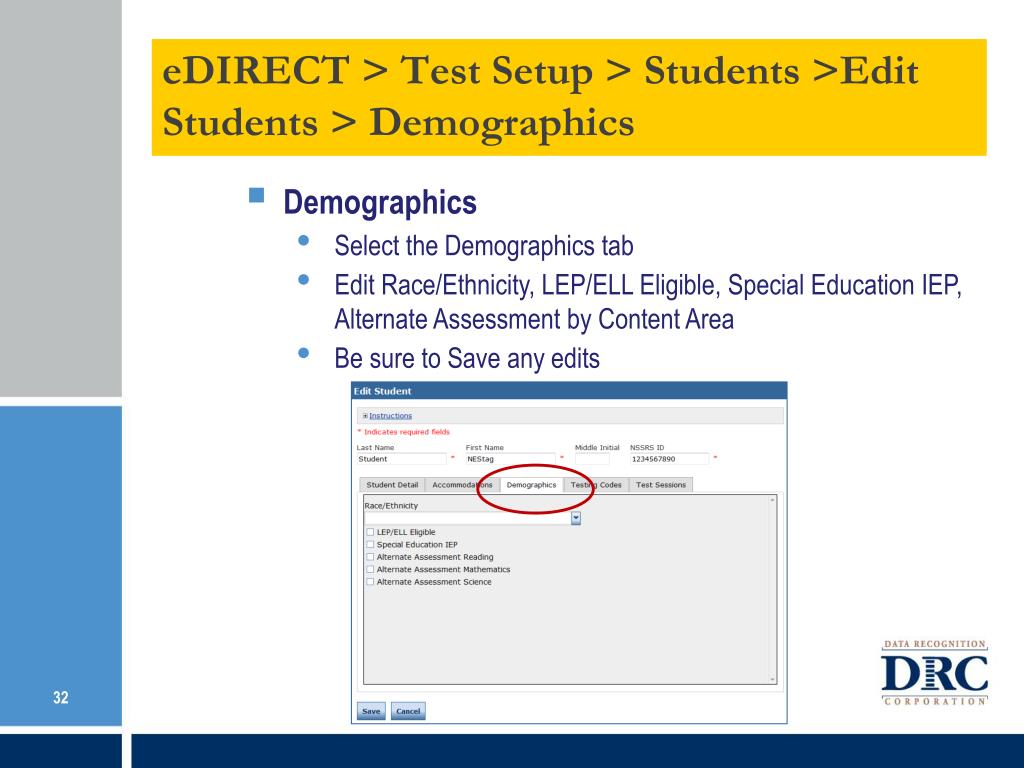 Online Testing > Management Tools > Data Tools > Add a Student eDIRECT > Test Setup > Students >Edit Students > Demographics • Demographics • Select the Demographics tab • Edit Race/Ethnicity, LEP/ELL Eligible, Special Education IEP, Alternate Assessment by Content Area • Be sure to Save any edits