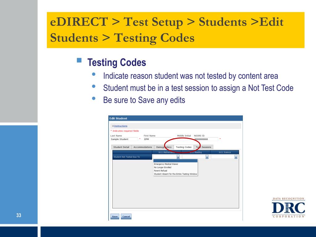 Online Testing > Management Tools > Data Tools > Add a Student eDIRECT > Test Setup > Students >Edit Students > Testing Codes • Testing Codes • Indicate reason student was not tested by content area • Student must be in a test session to assign a Not Test Code • Be sure to Save any edits