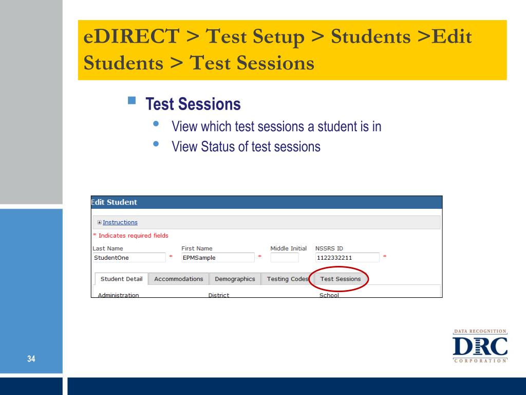 Online Testing > Management Tools > Data Tools > Add a Student eDIRECT > Test Setup > Students >Edit Students > Test Sessions • Test Sessions • View which test sessions a student is in • View Status of test sessions