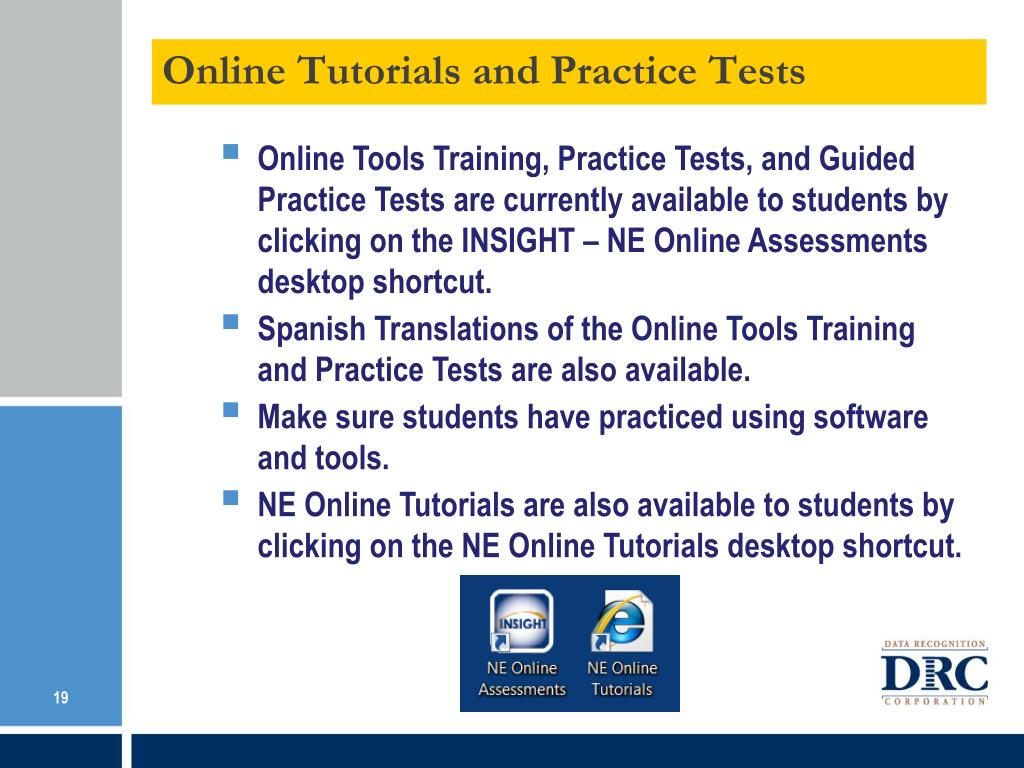 Online Tutorials and Practice Tests • Online Tools Training, Practice Tests, and Guided Practice Tests are currently available to students by clicking on the INSIGHT – NE Online Assessments desktop shortcut. • Spanish Translations of the Online Tools Training and Practice Tests are also available. • Make sure students have practiced using software and tools. • NE Online Tutorials are also available to students by clicking on the NE Online Tutorials desktop shortcut.