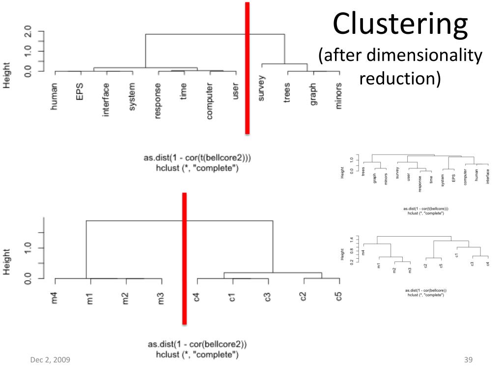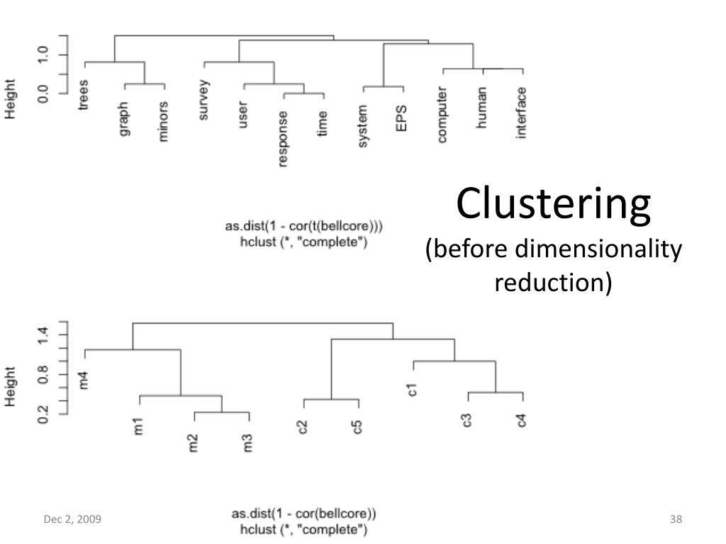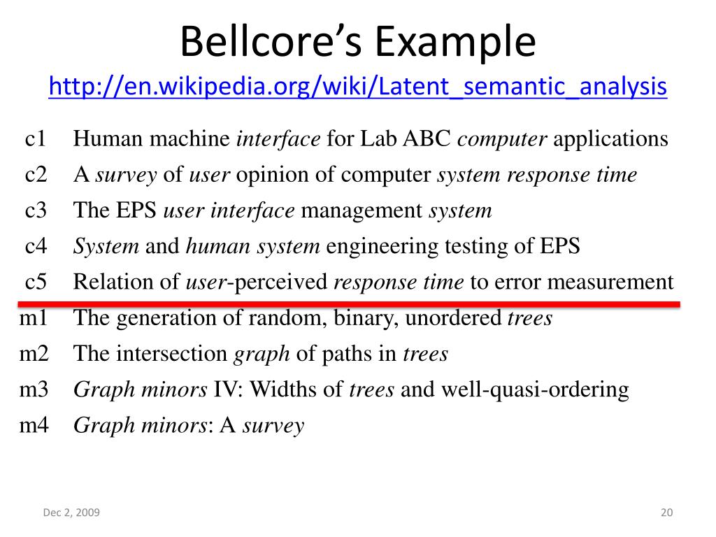 Bellcore’s Examplehttp://en.wikipedia.org/wiki/Latent_semantic_analysis c1 Human machine interface for Lab ABC computer applications c2 A survey of user opinion of computer system response time c3 The EPS user interface management system c4 System and humansystem engineering testing of EPS c5 Relation of user-perceived responsetime to error measurement m1 The generation of random, binary, unordered trees m2 The intersection graph of paths in trees m3 Graph minors IV: Widths of trees and well-quasi-ordering m4 Graph minors: A survey