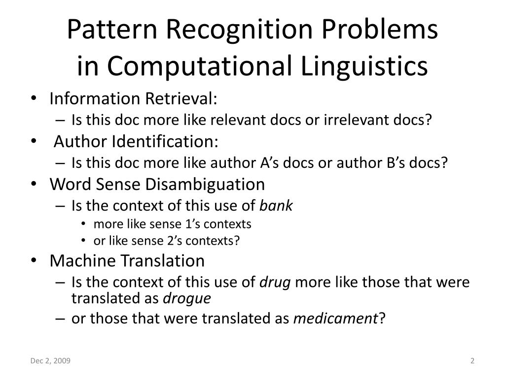 Pattern Recognition Problemsin Computational Linguistics • Information Retrieval: • Is this doc more like relevant docs or irrelevant docs? • Author Identification: • Is this doc more like author A’s docs or author B’s docs? • Word Sense Disambiguation • Is the context of this use of bank • more like sense 1’s contexts • or like sense 2’s contexts? • Machine Translation • Is the context of this use of drug more like those that were translated as drogue • or those that were translated as medicament?