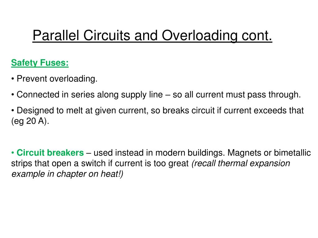 Parallel Circuits and Overloading cont. • Safety Fuses: • Prevent overloading. • Connected in series along supply line – so all current must pass through. • Designed to melt at given current, so breaks circuit if current exceeds that (eg 20 A). • Circuit breakers– used instead in modern buildings. Magnets or bimetallic strips that open a switch if current is too great (recall thermal expansion example in chapter on heat!)