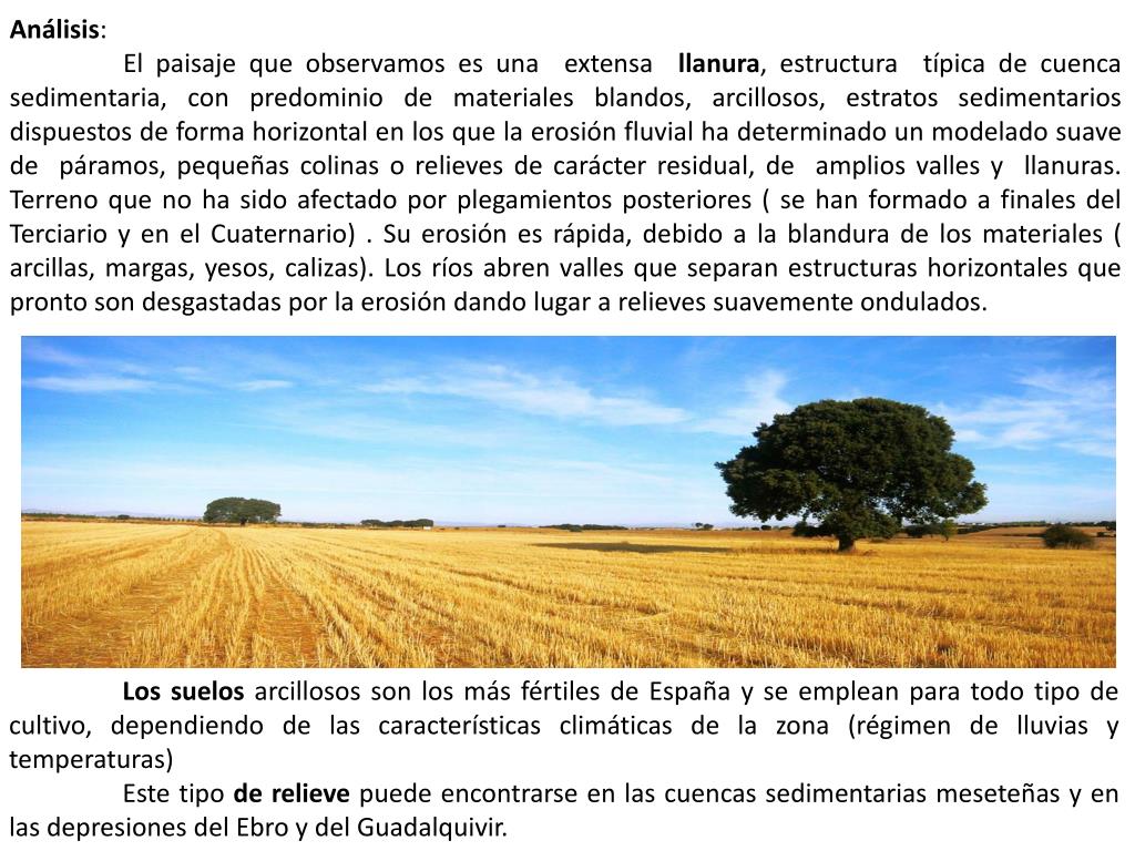 Análisis: El paisaje que observamos es una extensa llanura, estructura típica de cuenca sedimentaria, con predominio de materiales blandos, arcillosos, estratos sedimentarios dispuestos de forma horizontal en los que la erosión fluvial ha determinado un modelado suave de páramos, pequeñas colinas o relieves de carácter residual, de amplios valles y llanuras. Terreno que no ha sido afectado por plegamientos posteriores ( se han formado a finales del Terciario y en el Cuaternario) . Su erosión es rápida, debido a la blandura de los materiales ( arcillas, margas, yesos, calizas). Los ríos abren valles que separan estructuras horizontales que pronto son desgastadas por la erosión dando lugar a relieves suavemente ondulados. Los suelos arcillosos son los más fértiles de España y se emplean para todo tipo de cultivo, dependiendo de las características climáticas de la zona (régimen de lluvias y temperaturas) Este tipo de relieve puede encontrarse en las cuencas sedimentarias meseteñas y en las depresiones del Ebro y del Guadalquivir.