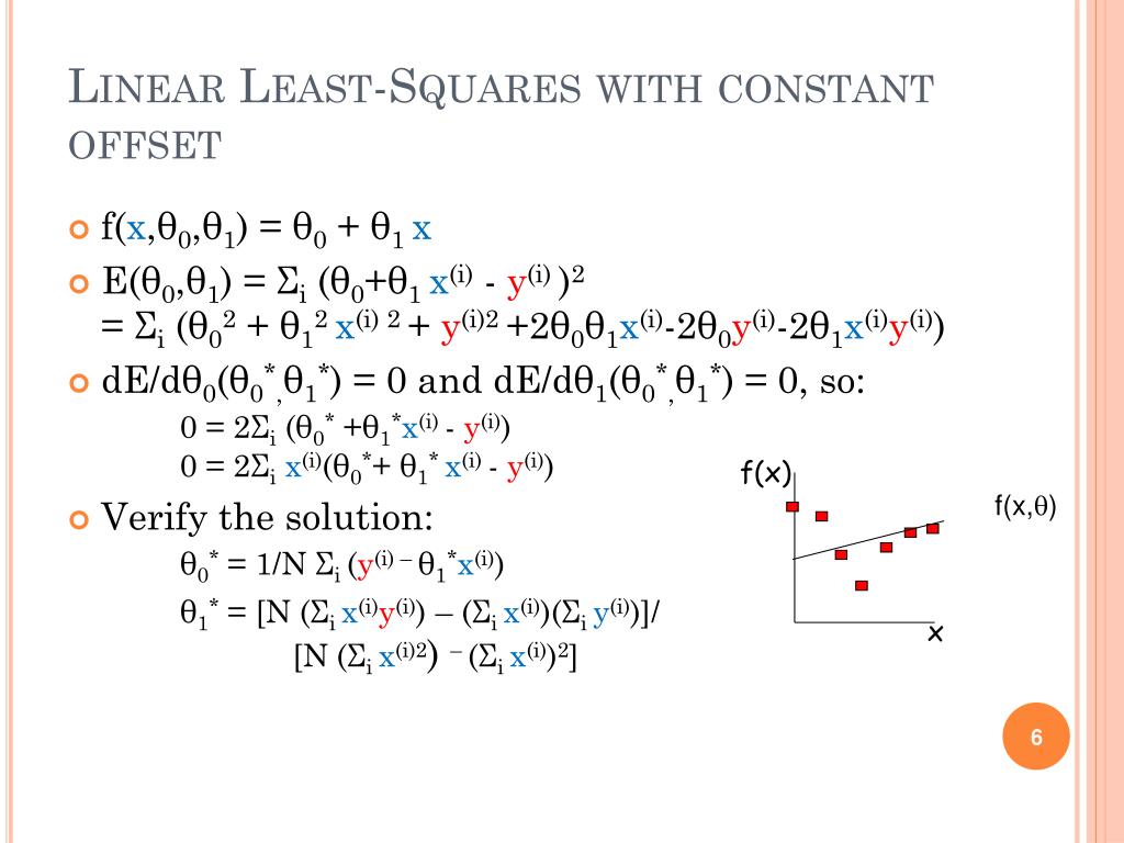 Linear Least-Squares with constant offset • f(x,θ0,θ1) = θ0 + θ1 x • E(θ0,θ1) = Σi(θ0+θ1 x(i) - y(i) )2= Σi(θ02 + θ12 x(i) 2+ y(i)2 +2θ0θ1x(i)-2θ0y(i)-2θ1x(i)y(i)) • dE/dθ0(θ0*,θ1*) = 0 and dE/dθ1(θ0*,θ1*) = 0, so:0 = 2Σi(θ0* +θ1*x(i) - y(i)) 0 = 2Σix(i)(θ0*+θ1* x(i) - y(i)) • Verify the solution:θ0*= 1/N Σi (y(i) – θ1*x(i)) θ1*= [N (Σi x(i)y(i)) – (Σi x(i))(Σi y(i))]/ [N (Σi x(i)2) – (Σi x(i))2] f(x) f(x,q) x