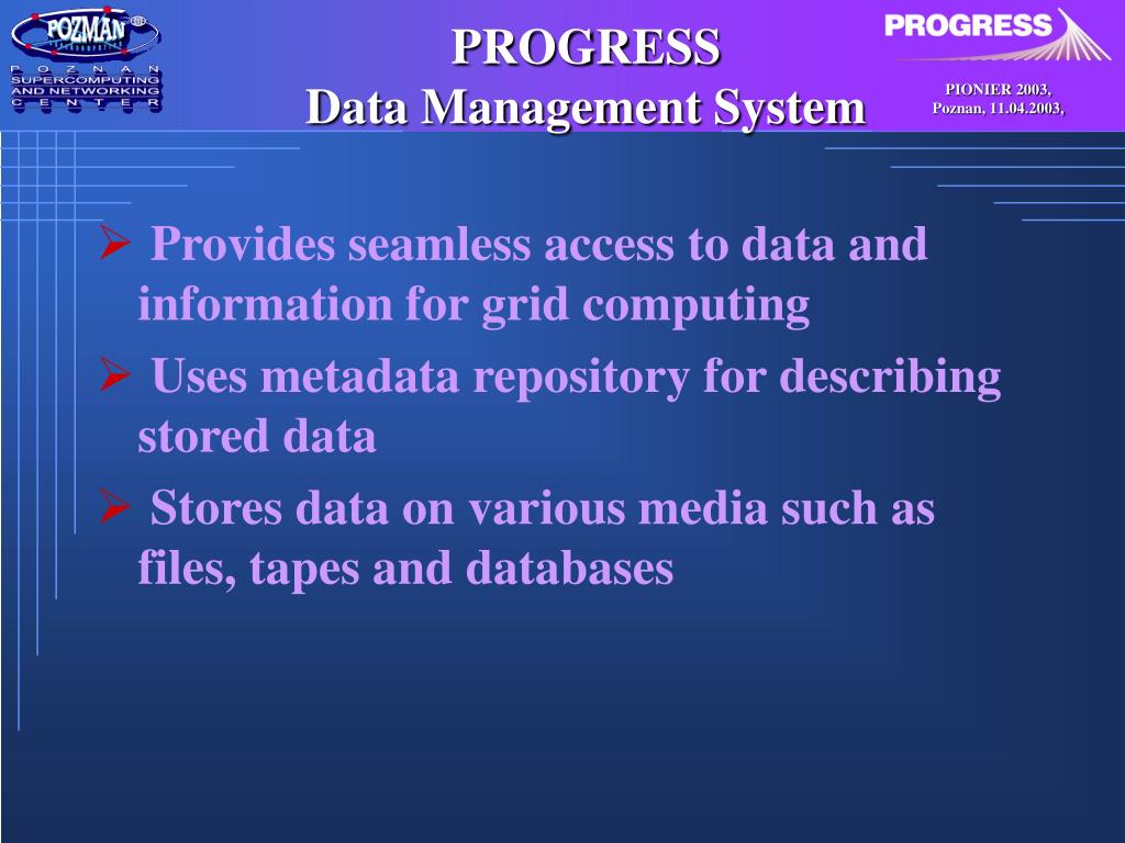 PROGRESSData Management System • Provides seamless access to data and information for grid computing • Uses metadata repository for describing stored data • Stores data on various media such as files, tapes and databases