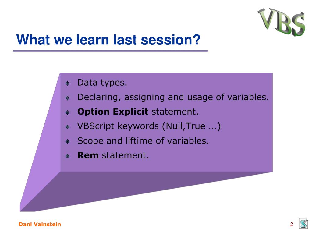 VBScript. Session 2. What we learn last session?. Data types. Declaring, assigning and usage of variables. Option Explicit statement. VBScript keywords (Null,True … ) Scope and liftime of variables. Rem statement. Subjets for Session 2. Scalar variables and array variables.
