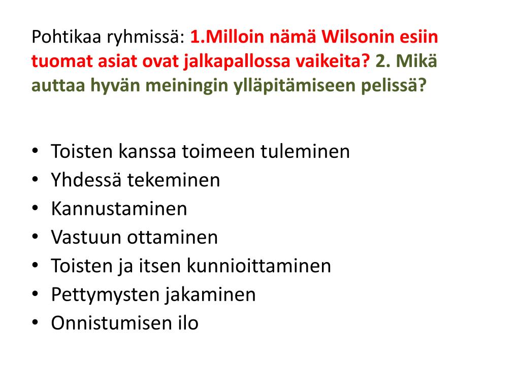 Pohtikaa ryhmissä: 1.Milloin nämä Wilsonin esiin tuomat asiat ovat jalkapallossa vaikeita?2. Mikä auttaa hyvän meiningin ylläpitämiseen pelissä? • Toisten kanssa toimeen tuleminen • Yhdessä tekeminen • Kannustaminen • Vastuun ottaminen • Toisten ja itsen kunnioittaminen • Pettymysten jakaminen • Onnistumisen ilo