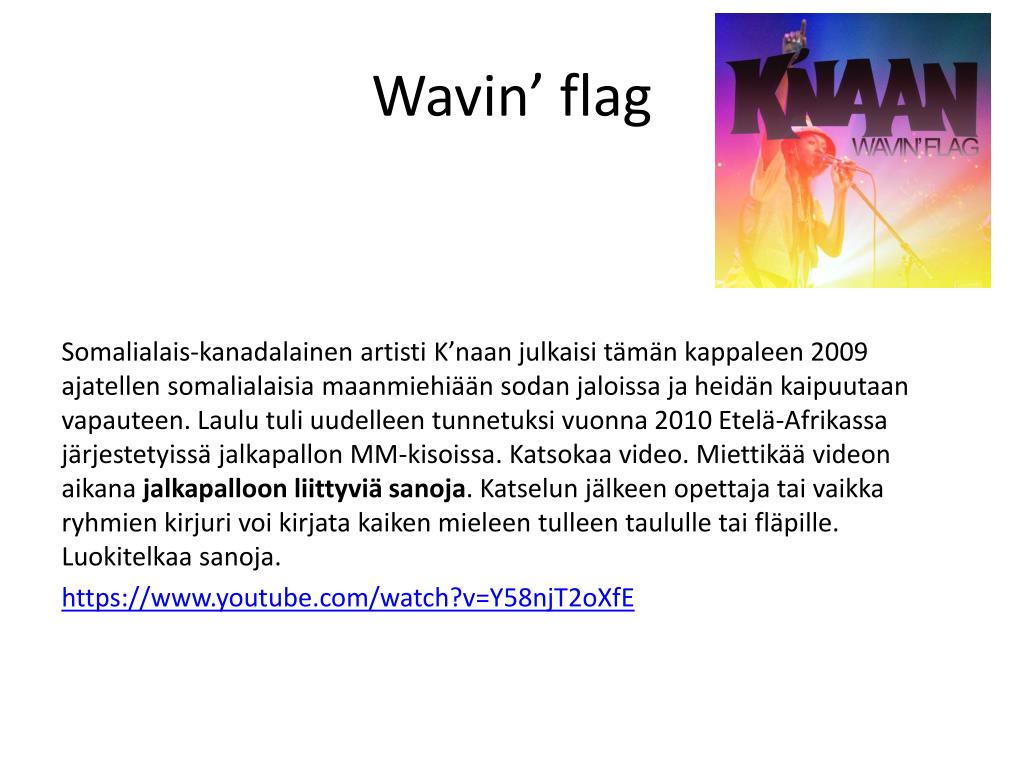 Wavin’ flag Somalialais-kanadalainen artisti K’naan julkaisi tämän kappaleen 2009 ajatellen somalialaisia maanmiehiään sodan jaloissa ja heidän kaipuutaan vapauteen. Laulu tuli uudelleen tunnetuksi vuonna 2010 Etelä-Afrikassa järjestetyissä jalkapallon MM-kisoissa. Katsokaa video. Miettikää videon aikana jalkapalloon liittyviä sanoja. Katselun jälkeen opettaja tai vaikka ryhmien kirjuri voi kirjata kaiken mieleen tulleen taululle tai fläpille. Luokitelkaa sanoja. https://www.youtube.com/watch?v=Y58njT2oXfE