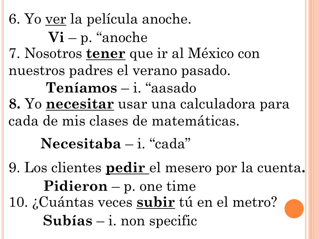 6. Yo ver la película anoche. Vi – p. “anoche • 7. Nosotros tener que ir al México con nuestros padres el verano pasado. Teníamos– i. “aasado 8. Yo necesitar usar una calculadora para cada de mis clases de matemáticas. Necesitaba– i. “cada” • 9. Los clientes pedir el mesero por la cuenta. Pidieron– p. one time • 10. ¿Cuántas veces subir tú en el metro? Subías– i. non specific