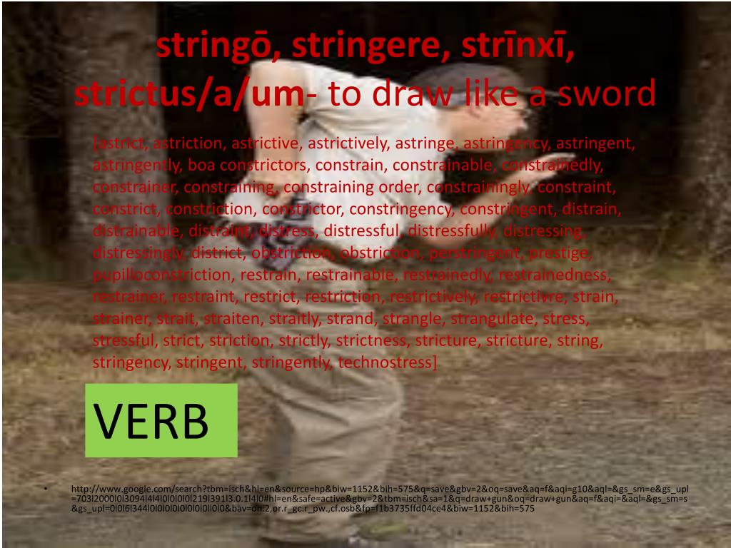 stringō, stringere, strīnxī, strictus/a/um- to draw like a sword • http://www.google.com/search?tbm=isch&hl=en&source=hp&biw=1152&bih=575&q=save&gbv=2&oq=save&aq=f&aqi=g10&aql=&gs_sm=e&gs_upl=703l2000l0l3094l4l4l0l0l0l0l219l391l3.0.1l4l0#hl=en&safe=active&gbv=2&tbm=isch&sa=1&q=draw+gun&oq=draw+gun&aq=f&aqi=&aql=&gs_sm=s&gs_upl=0l0l6l344l0l0l0l0l0l0l0l0ll0l0&bav=on.2,or.r_gc.r_pw.,cf.osb&fp=f1b3735ffd04ce4&biw=1152&bih=575 [astrict, astriction, astrictive, astrictively, astringe, astringency, astringent, astringently, boa constrictors, constrain, constrainable, constrainedly, constrainer, constraining, constraining order, constrainingly, constraint, constrict, constriction, constrictor, constringency, constringent, distrain, distrainable, distraint, distress, distressful, distressfully, distressing, distressingly, district, obstriction, obstriction, perstringent, prestige, pupilloconstriction, restrain, restrainable, restrainedly, restrainedness, restrainer, restraint, restrict, restriction, restrictively, restrictivre, strain, strainer, strait, straiten, straitly, strand, strangle, strangulate, stress, stressful, strict, striction, strictly, strictness, stricture, stricture, string, stringency, stringent, stringently, technostress] VERB