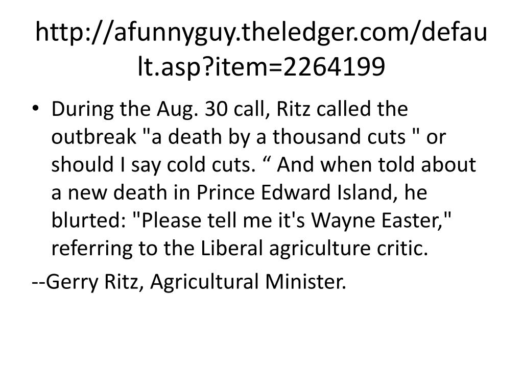 http://afunnyguy.theledger.com/default.asp?item=2264199 • During the Aug. 30 call, Ritz called the outbreak "a death by a thousand cuts " or should I say cold cuts. “ And when told about a new death in Prince Edward Island, he blurted: "Please tell me it's Wayne Easter," referring to the Liberal agriculture critic. --Gerry Ritz, Agricultural Minister.