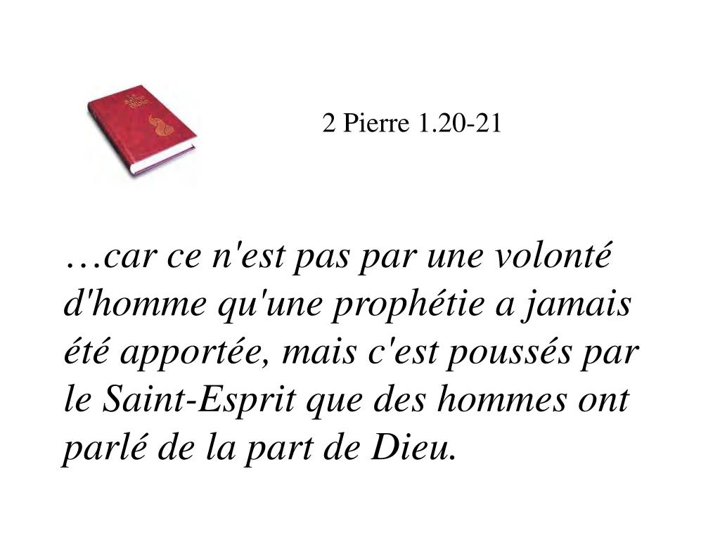 2 Pierre 1.20-21 …car ce n'est pas par une volonté d'homme qu'une prophétie a jamais été apportée, mais c'est poussés par le Saint-Esprit que des hommes ont parlé de la part de Dieu.