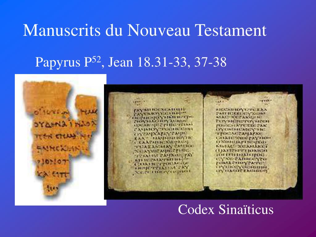 Manuscrits du Nouveau Testament Papyrus P52, Jean 18.31-33, 37-38 Codex Sinaïticus