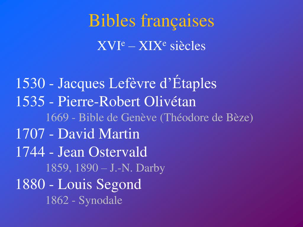 Bibles françaises XVIe – XIXe siècles 1530 - Jacques Lefèvre d’Étaples 1535 - Pierre-Robert Olivétan 1669 - Bible de Genève (Théodore de Bèze) 1707 - David Martin 1744 - Jean Ostervald 1859, 1890 – J.-N. Darby 1880 - Louis Segond 1862 - Synodale