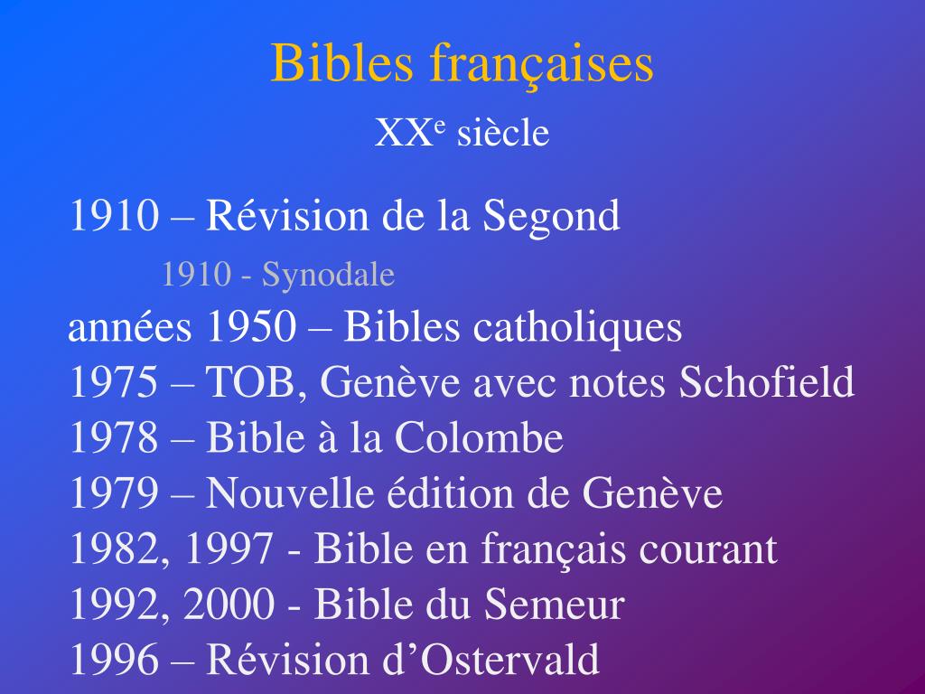Bibles françaises XXe siècle 1910 – Révision de la Segond 1910 - Synodale années 1950 – Bibles catholiques 1975 – TOB, Genève avec notes Schofield 1978 – Bible à la Colombe 1979 – Nouvelle édition de Genève 1982, 1997 - Bible en français courant 1992, 2000 - Bible du Semeur 1996 – Révision d’Ostervald