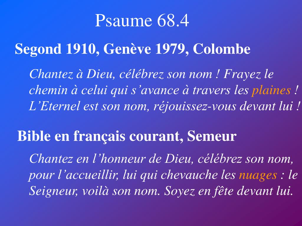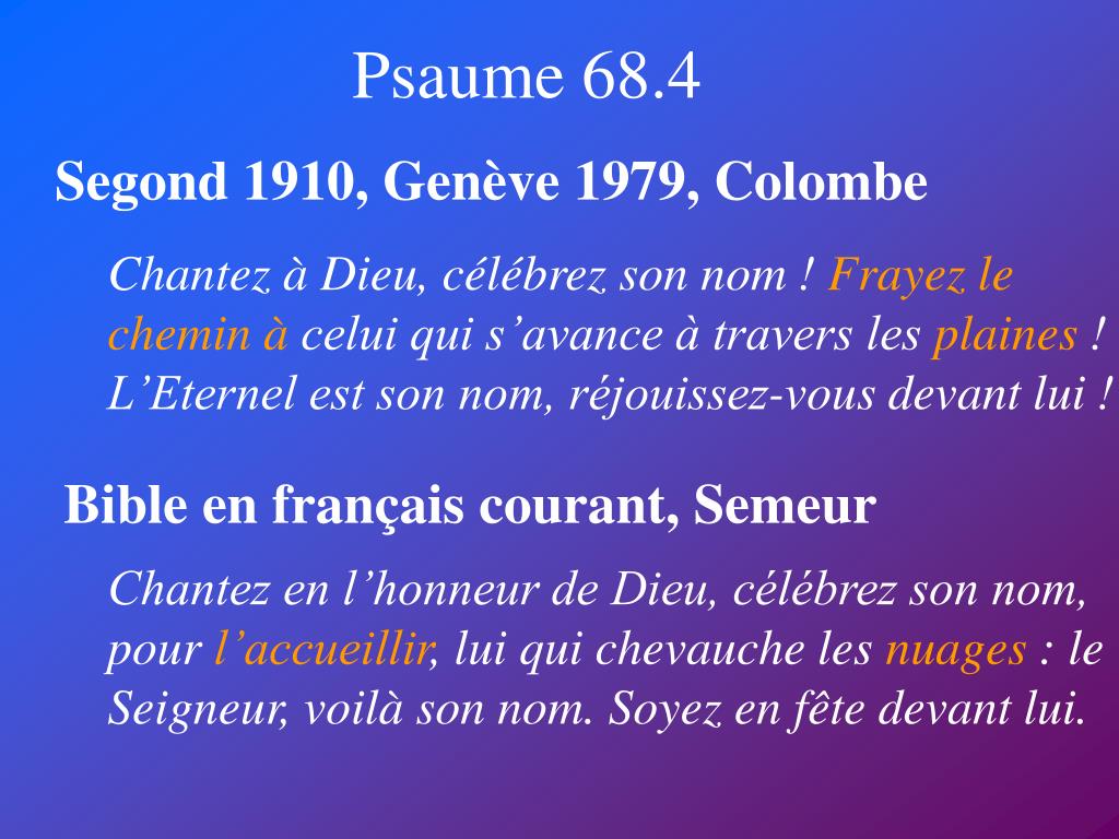 La Bible en français. La Bible en français. Quelle est la meilleure version ?. Psaume 68.4. Segond 1910, Genève 1979, Colombe. Chantez à Dieu, célébrez son nom ! Frayez le chemin à celui qui s’avance à travers les plaines ! L’Eternel est son nom, réjouissez-vous devant lui !.