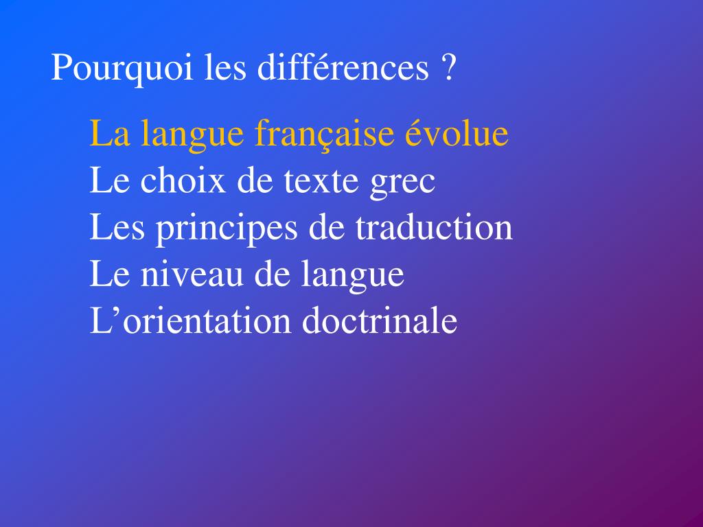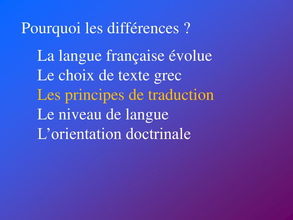 Pourquoi les différences ? • La langue française évolue • Le choix de texte grec • Les principes de traduction • Le niveau de langue • L’orientation doctrinale