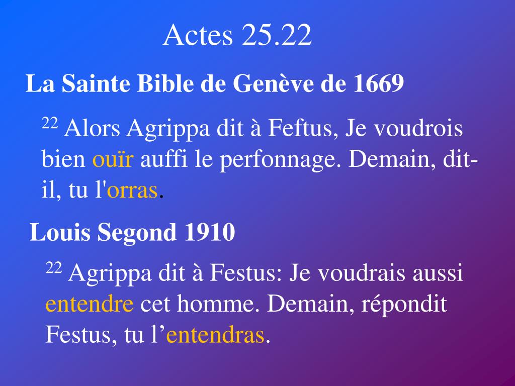 Actes 25.22 La Sainte Bible de Genève de 1669 22 Alors Agrippa dit à Feftus, Je voudrois bien ouïrauffi le perfonnage. Demain, dit-il, tu l'orras. Louis Segond 1910 22 Agrippa dit à Festus: Je voudrais aussi entendre cet homme. Demain, répondit Festus, tu l’entendras.
