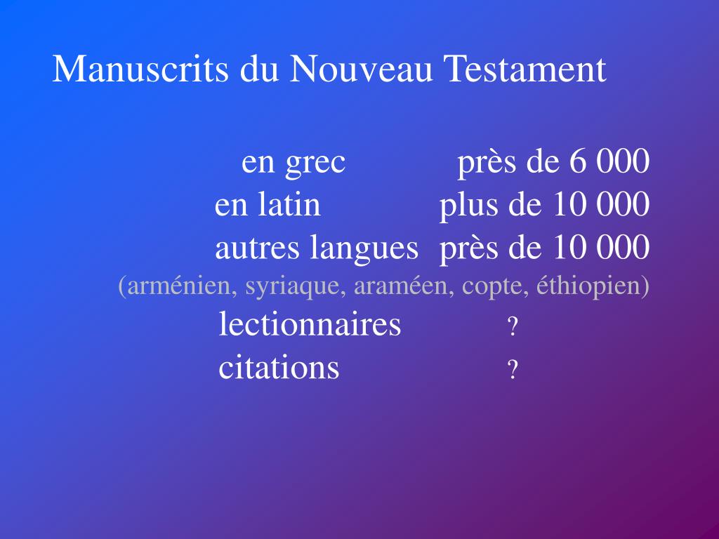 Manuscrits du Nouveau Testament en grecprès de 6 000 en latin plus de 10 000 autreslanguesprès de 10 000 (arménien, syriaque, araméen, copte, éthiopien) lectionnaires? citations ?