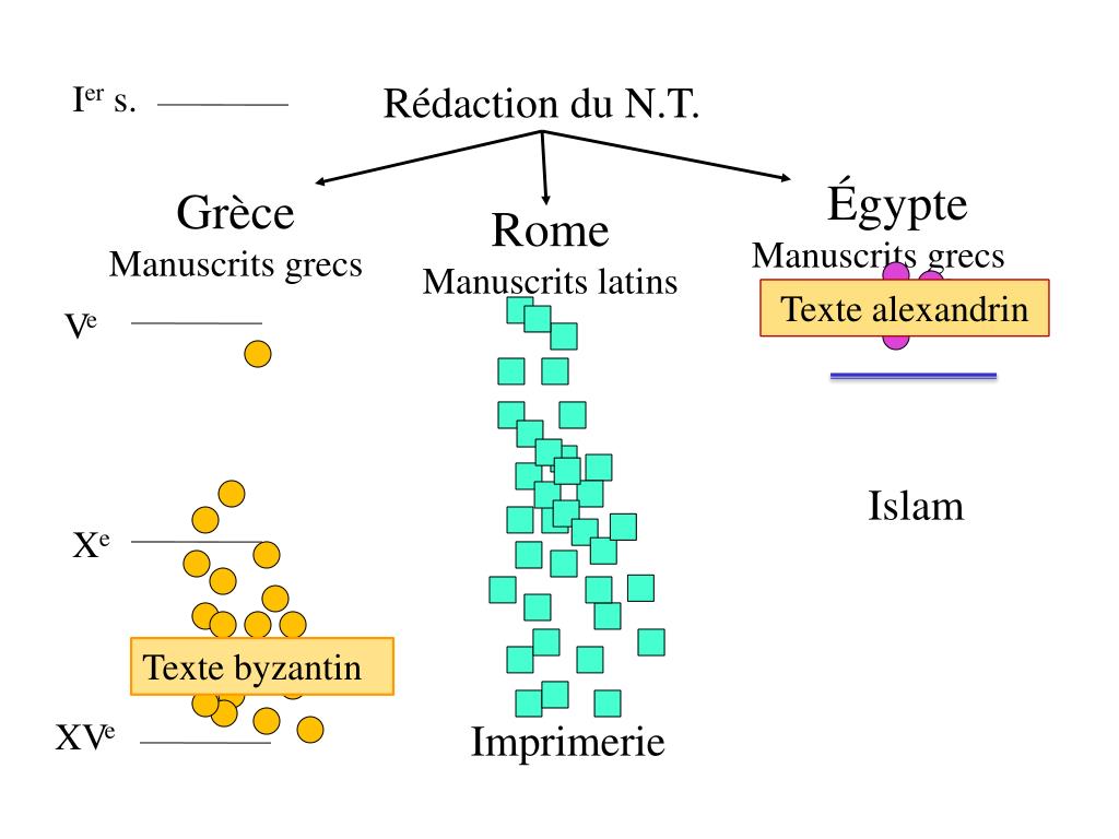 Ier s. Rédaction du N.T. ccÉgypte Manuscrits grecs Grèce Manuscrits grecs Rome Manuscrits latins Texte alexandrin Ve Islam Xe Texte byzantin XVe Imprimerie