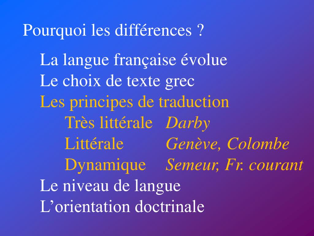 Pourquoi les différences ? • La langue française évolue • Le choix de texte grec • Les principes de traduction • Très littérale Darby • Littérale Genève, Colombe • Dynamique Semeur, Fr. courant • Le niveau de langue • L’orientation doctrinale