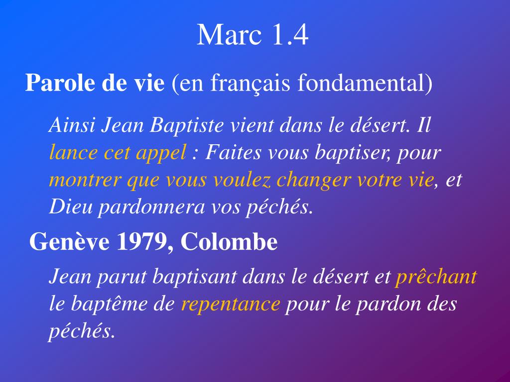 Marc 1.4 Parole de vie (en français fondamental) Ainsi Jean Baptiste vient dans le désert. Il lance cet appel : Faites vous baptiser, pour montrer que vous voulez changer votre vie, et Dieu pardonnera vos péchés. Genève 1979, Colombe Jean parut baptisant dans le désert et prêchant le baptême de repentance pour le pardon des péchés.