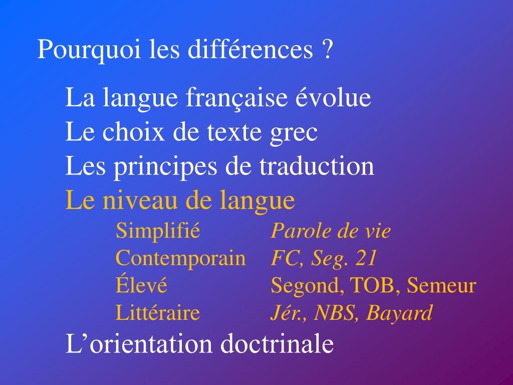 Pourquoi les différences ? • La langue française évolue • Le choix de texte grec • Les principes de traduction • Le niveau de langue • Simplifié Parole de vie • Contemporain FC, Seg. 21 • Élevé Segond, TOB, Semeur • Littéraire Jér., NBS, Bayard • L’orientation doctrinale