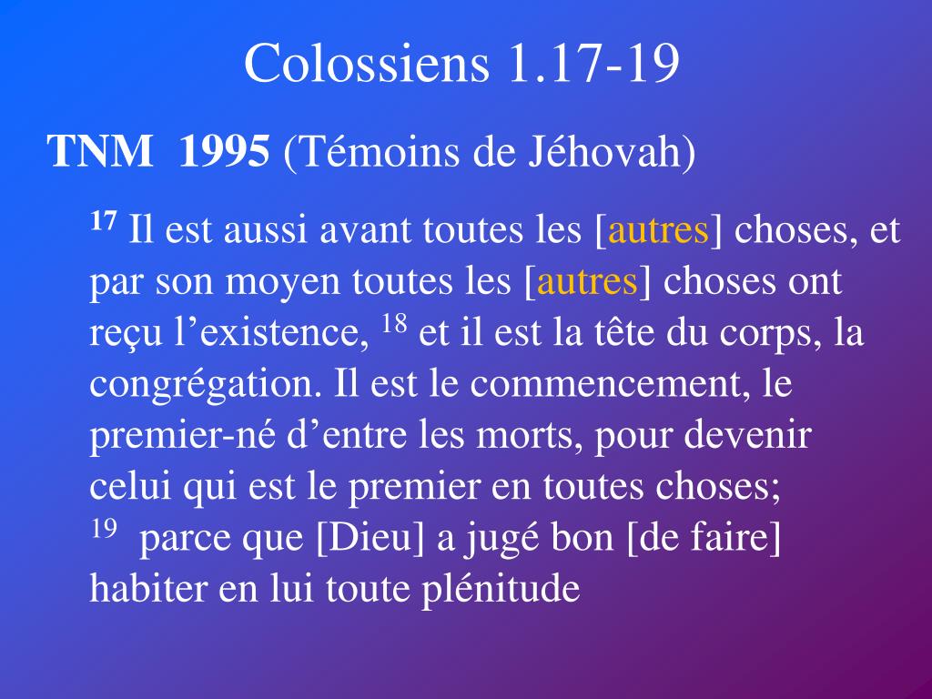 Colossiens 1.17-19 TNM 1995 (Témoins de Jéhovah) 17 Il est aussi avant toutes les [autres] choses, et par son moyen toutes les [autres] choses ont reçu l’existence, 18 et il est la tête du corps, la congrégation. Il est le commencement, le premier-né d’entre les morts, pour devenir celui qui est le premier en toutes choses; 19 parce que [Dieu] a jugé bon [de faire] habiter en lui toute plénitude