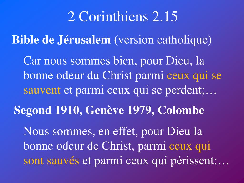 2 Corinthiens 2.15 Bible de Jérusalem (version catholique) Car nous sommes bien, pour Dieu, la bonne odeur du Christ parmi ceux qui se sauvent et parmi ceux qui se perdent;… Segond 1910, Genève 1979, Colombe Nous sommes, en effet, pour Dieu la bonne odeur de Christ, parmi ceux qui sont sauvés et parmi ceux qui périssent:…