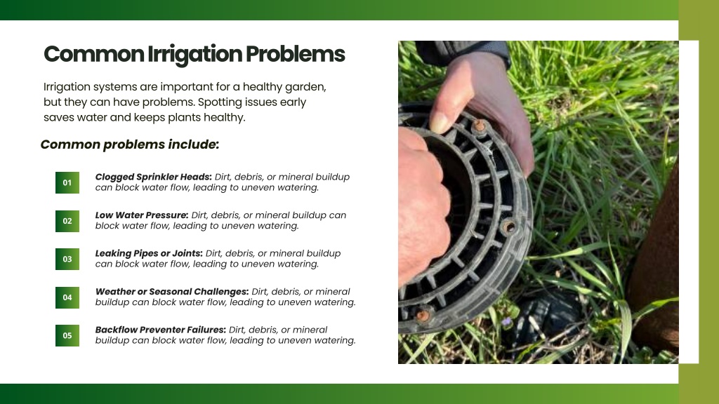 Common Irrigation Problems Irrigation systems are important for a healthy garden, but they can have problems. Spotting issues early saves water and keeps plants healthy. Common problems include: Clogged Sprinkler Heads: Dirt, debris, or mineral buildup can block water flow, leading to uneven watering. 01 Low Water Pressure: Dirt, debris, or mineral buildup can block water flow, leading to uneven watering. 02 Leaking Pipes or Joints: Dirt, debris, or mineral buildup can block water flow, leading to uneven watering. 03 Weather or Seasonal Challenges: Dirt, debris, or mineral buildup can block water flow, leading to uneven watering. 04 Backflow Preventer Failures: Dirt, debris, or mineral buildup can block water flow, leading to uneven watering. 05