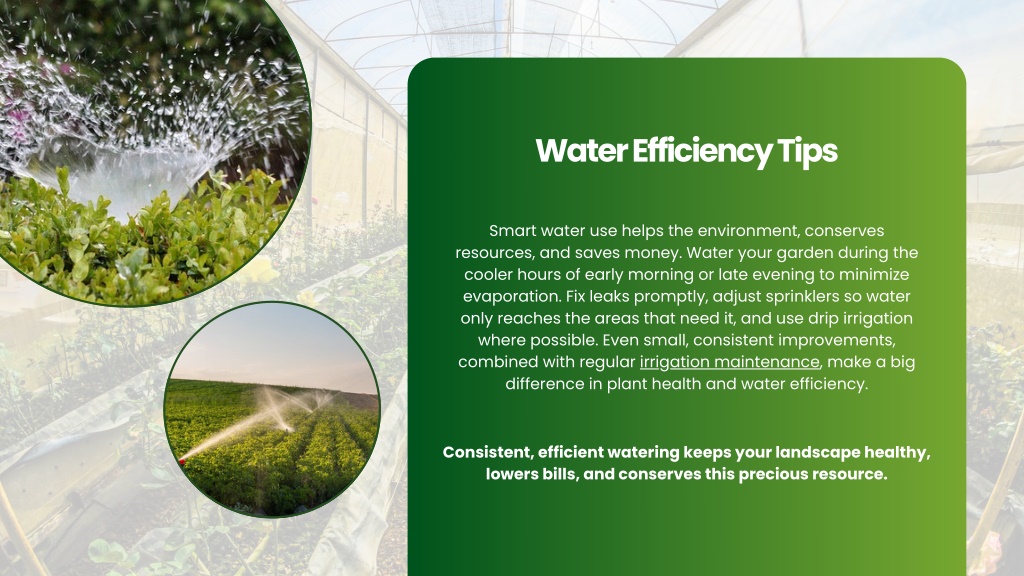 Water Efficiency Tips Smart water use helps the environment, conserves resources, and saves money. Water your garden during the cooler hours of early morning or late evening to minimize evaporation. Fix leaks promptly, adjust sprinklers so water only reaches the areas that need it, and use drip irrigation where possible. Even small, consistent improvements, combined with regular irrigation maintenance, make a big difference in plant health and water efficiency. Consistent, efficient watering keeps your landscape healthy, lowers bills, and conserves this precious resource.