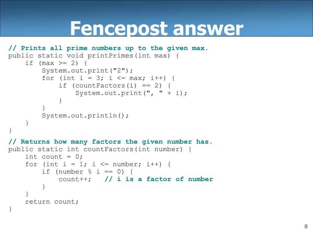 Fencepost answer // Prints all prime numbers up to the given max. public static void printPrimes(int max) { if (max >= 2) { System.out.print("2"); for (int i = 3; i <= max; i++) { if (countFactors(i) == 2) { System.out.print(", " + i); } } System.out.println(); } } // Returns how many factors the given number has. public static int countFactors(int number) { int count = 0; for (int i = 1; i <= number; i++) { if (number % i == 0) { count++; // i is a factor of number } } return count; }
