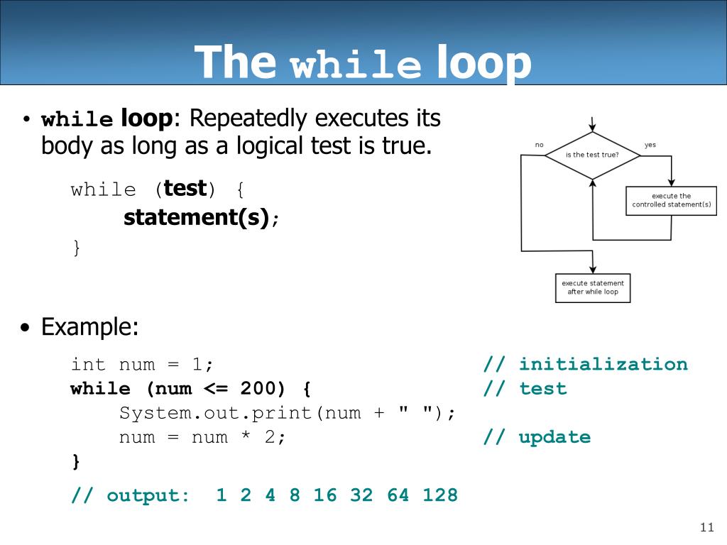 The while loop while loop: Repeatedly executes itsbody as long as a logical test is true. while (test) { statement(s); } Example: int num = 1; // initialization while (num <= 200) { // test System.out.print(num + " "); num = num * 2; // update } // output: 1 2 4 8 16 32 64 128