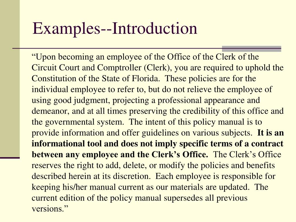 Examples--Introduction “Upon becoming an employee of the Office of the Clerk of the Circuit Court and Comptroller (Clerk), you are required to uphold the Constitution of the State of Florida. These policies are for the individual employee to refer to, but do not relieve the employee of using good judgment, projecting a professional appearance and demeanor, and at all times preserving the credibility of this office and the governmental system. The intent of this policy manual is to provide information and offer guidelines on various subjects. It is an informational tool and does not imply specific terms of a contract between any employee and the Clerk’s Office.The Clerk’s Office reserves the right to add, delete, or modify the policies and benefits described herein at its discretion. Each employee is responsible for keeping his/her manual current as our materials are updated. The current edition of the policy manual supersedes all previous versions.”