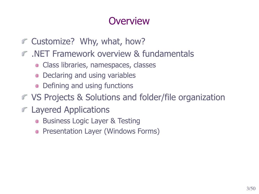 Overview • Customize? Why, what, how? • .NET Framework overview & fundamentals • Class libraries, namespaces, classes • Declaring and using variables • Defining and using functions • VS Projects & Solutions and folder/file organization • Layered Applications • Business Logic Layer & Testing • Presentation Layer (Windows Forms)