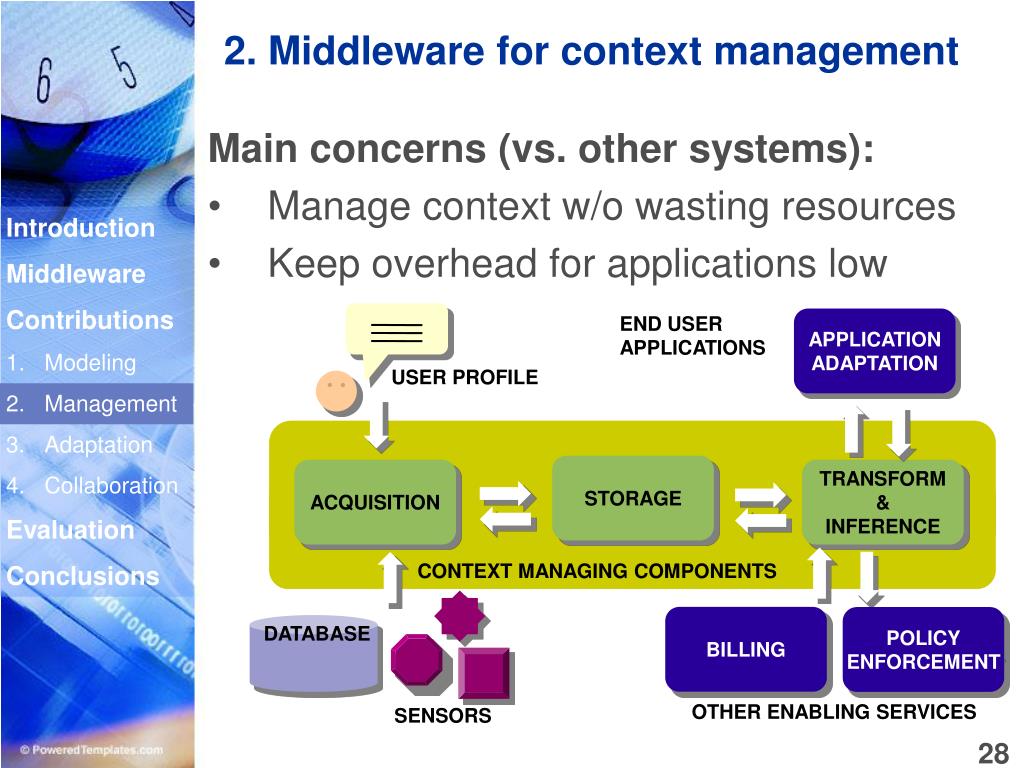 Introduction • Middleware • Contributions • Modeling • Management • Adaptation • Collaboration • Evaluation • Conclusions 1. Context modeling and reasoning CoDAMoS context ontology in OWL Major concepts • User • Environment • Platform • Services Relevance and Ambiguity • Accuracy • Precision • Freshness • Spatial coverage • Sampling rate • …