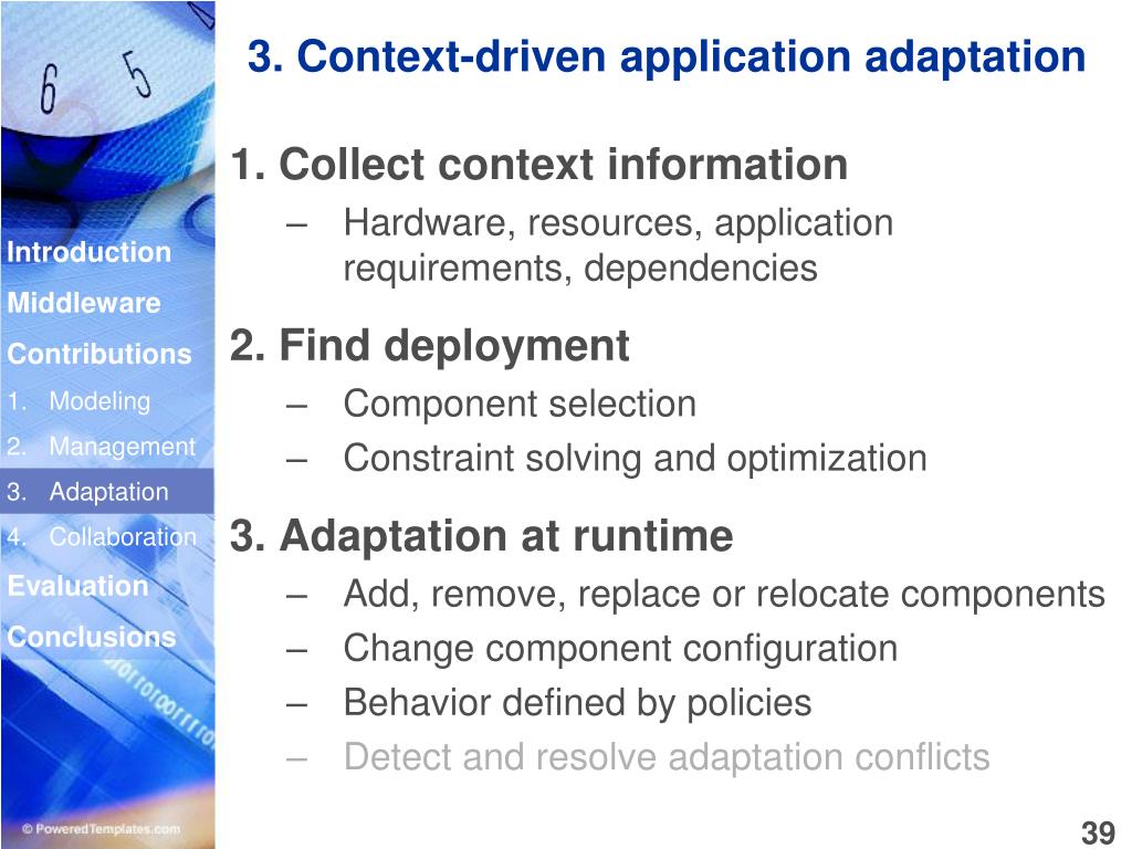 Introduction • Middleware • Contributions • Modeling • Management • Adaptation • Collaboration • Evaluation • Conclusions 3. Context-driven application adaptation Adapt GUI component to resources • Screen size, memory, CPU, … • Graphics support (e.g. virtual machine) Simple text report on small screen Graphical report on bigger display